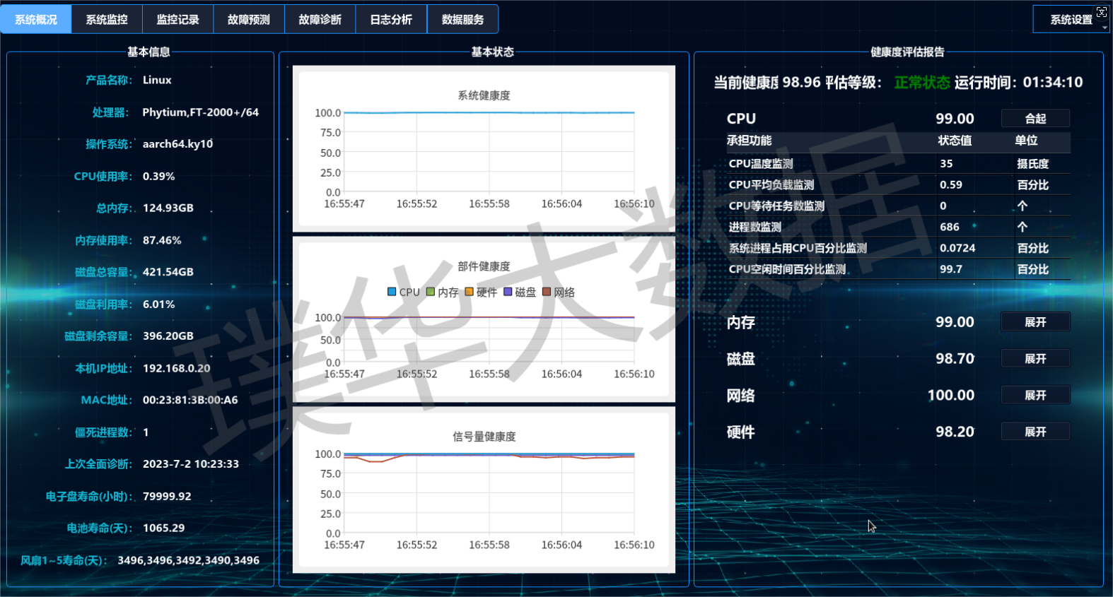 某国产服务器健康管理系统项目,通过HawkEye健康管理(PHM)系统实现数据采集、设备监控、数据服务、故障诊断分析、健康评估、故障预测、其他管理等功能。其中对关键部件:电源、显示器、电子盘、处理器、操控模块、风机模块要建立故障诊断分析模型、健康评估模型、故障预测模型。