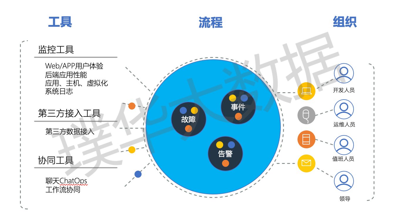 告警管理是设备监控、网络监控、日志监控等场景的下游,其提供了统一的告警管理能力。其面向运维中最关键的日常值班与故障处理场景,告警平台提供了优秀的告警关联能力,它将告警与配置信息、服务流程、监控数据相关联,形成了一警一场景,可以让运维团队的协作像流水线作业一样主动和高效。