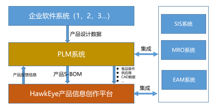 基于HawkEye产品信息创作平台解决方案,通过服务 BOM(S-BOM)打通产品研发中的服务信息,为整个产品生命周期的闭环数据流提供支撑。本解决方案与企业PLM系统集成部署应用,并融合SIS(监控信息管理)、MRO(大修维护)和EMA(企业资产管理)三类系统各自的部分功能,通过S-BOM提供产品全生命周期内所关注服务环节所需的信息。