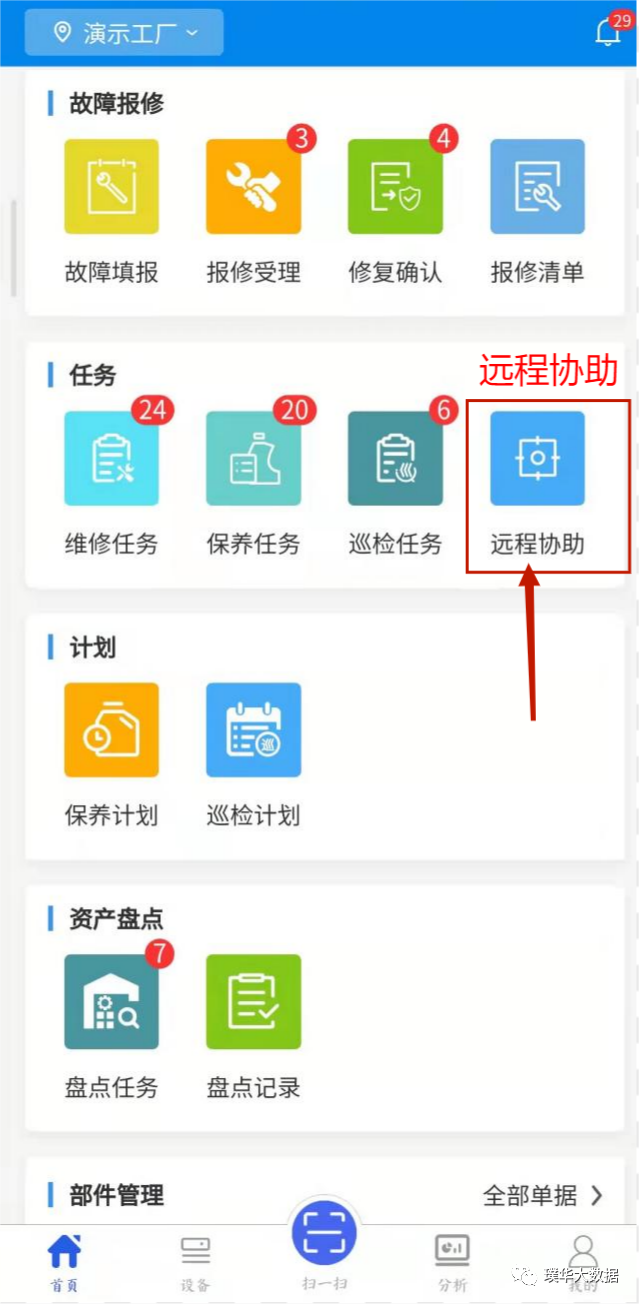 璞华联合业内领先的AR厂商,共同推出面向设备运维的远程协作平台,可以在设备巡检、维修、保养、售后等环节,实时连接远程专家和现场人员,让知识共享打破空间限制,增强工作现场赋能于人,将设备故障第一视角高清音视频画面回传,远程专家通过万事贴、激光笔、冻屏等现场协作工具为现场人员提供精准的可视化指导,成倍提升沟通协作效率。