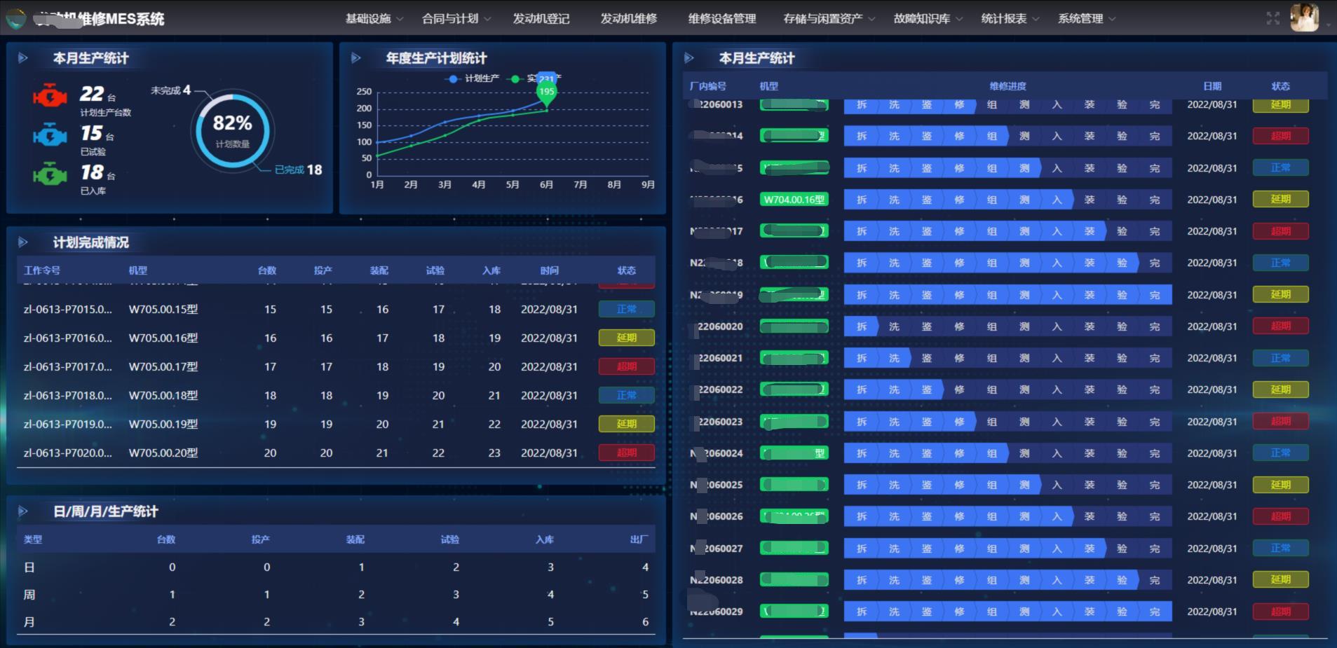 从维修任务计划下达、15个工段,100+工序工卡的执行情况、维修过程中的记录、质量管理及监控管理,实现整个流程的集成化管理。
