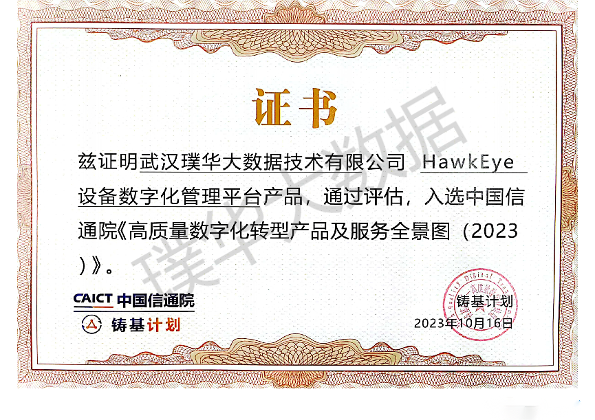 武汉璞华大数据技术有限公司HawkEye设备数字化管理平台产品,凭借优秀的产品技术能力,通过评估后,入选中国信通院“铸基计划”《高质量数字化转型产品及服务全景图(2023)》的工业数字化领域。