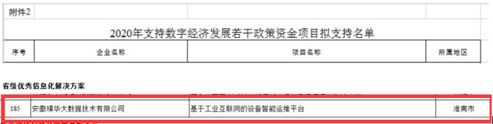 为支持大数据产业高质量发展,壮大数字经济,促进数字产业化和产业数字化,改善大数据企业发展环境,推动大数据与实体经济深度融合,促进大数据产业集聚,安徽省近日发布了2020年数字经济发展若干政策资金项目支持名单,公司基于工业互联网的设备智能运维平台项目获评省级优秀信息化解决方案。