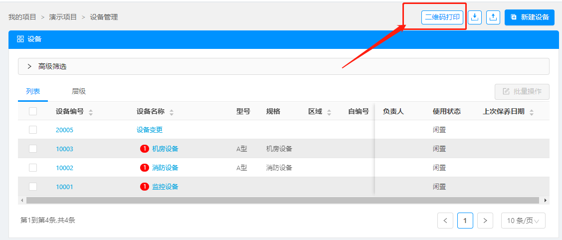 针对这样的情况,璞华大数据HawkEye设备数字化管理平台推出了二维码管理功能,系统自动编码,实现一物一码,将生成的二维码贴到设备上,作为唯一的标识。